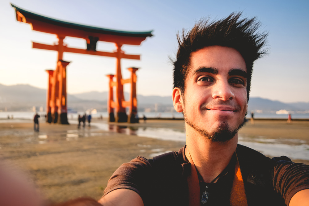 Young,Traveler,And,Great,Torii,Gates,At,Miyajima,Island,,Japan